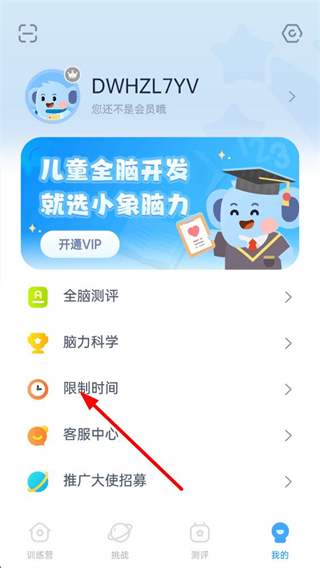 2、進入我的頁面后,能看到當前不是會員,界面有兒童全腦開發就選小象腦力的提示,下方有全腦測評腦力科學限制時間等功能選項,可點擊限制時間進行設置。