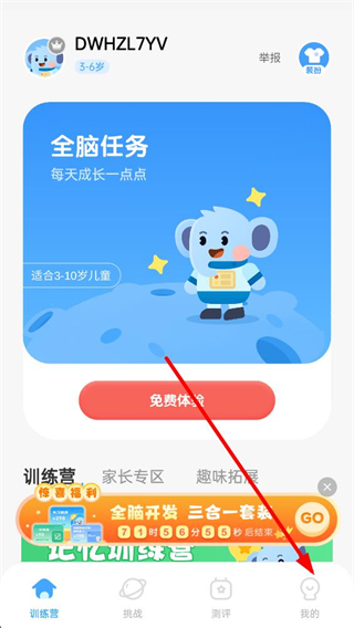 1、進入小象腦力后,先看到全腦任務界面,界面顯示每天成長一點點,還有免費體驗按鈕,底部有訓練營家長專區趣味拓展等選項,可點擊我的進入對應頁面。