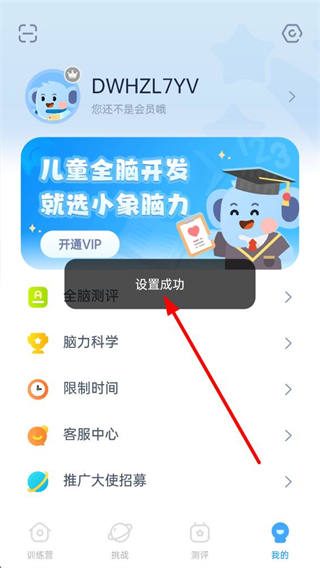 4、完成時長設置后,頁面會顯示設置成功的提示,回到我的頁面,可繼續查看全腦測評客服中心推廣大使招募等功能,繼續使用小象腦力的相關服務。