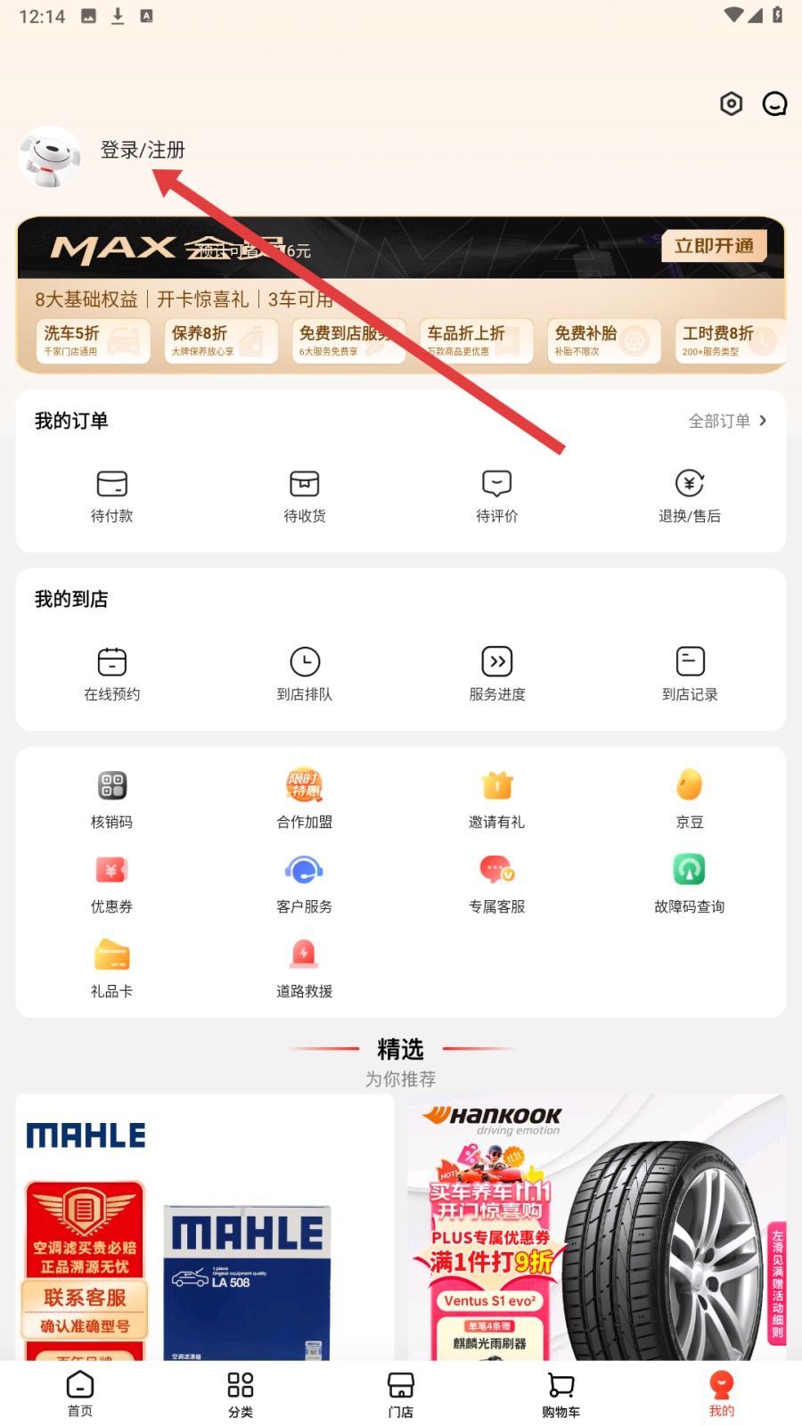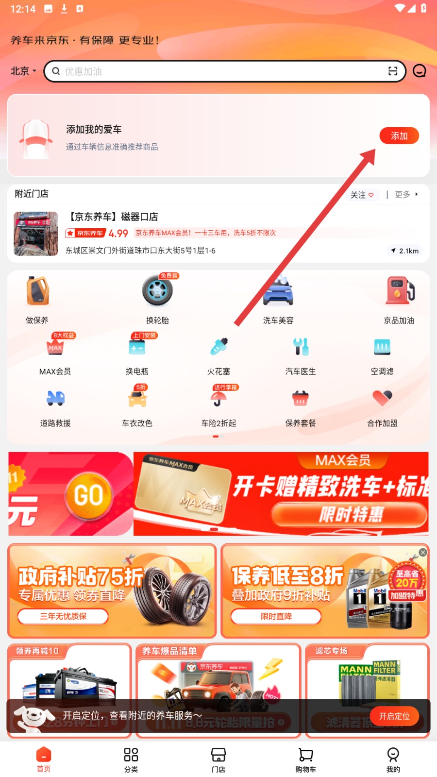 1、進入京東養車主頁,可添加自己的愛車,以便獲取準確的養車商品推薦,同時能查看附近門店及各類養車服務選項。