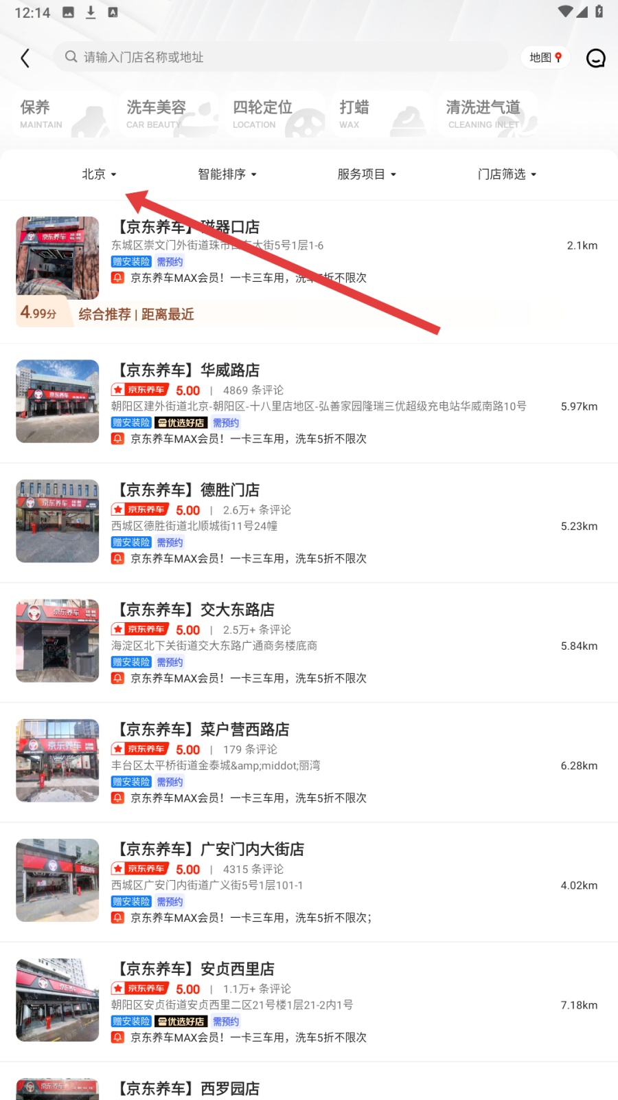 4、門店列表頁,可選擇所在城市,查看該城市的京東養車門店信息,包括門店評分、距離、地址及服務項目等。