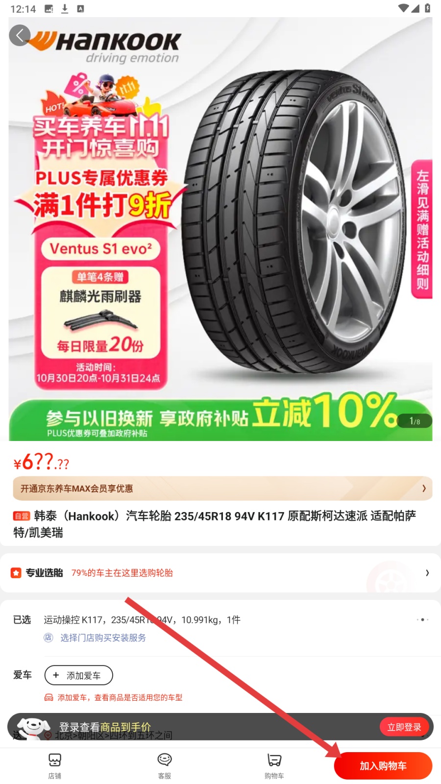 3、商品詳情頁,可查看韓泰輪胎等商品的優惠活動、價格及適配車型等信息,點擊加入購物車可將商品加入購物車。
