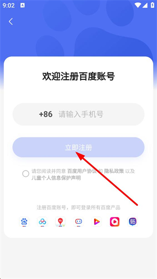 4、若沒有賬號可點擊注冊,輸入手機號后點擊立即注冊,注冊后可登錄所有百度產品,享受更多服務。