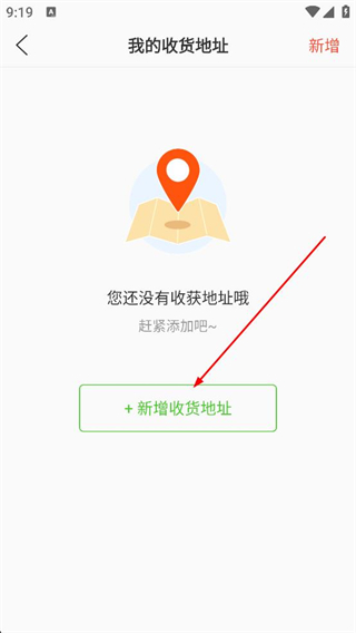 2、進入我的收貨地址頁面,若還沒有收貨地址,點擊新增收貨地址可進入新增地址頁面,開始填寫收貨信息。