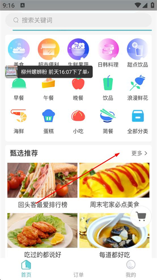 4、進入APP首頁可查看美食、超市便利等分類入口,點擊甄選推薦的更多可查看更多美食推薦,周末宅家必點美食等,方便選擇想吃的美食。