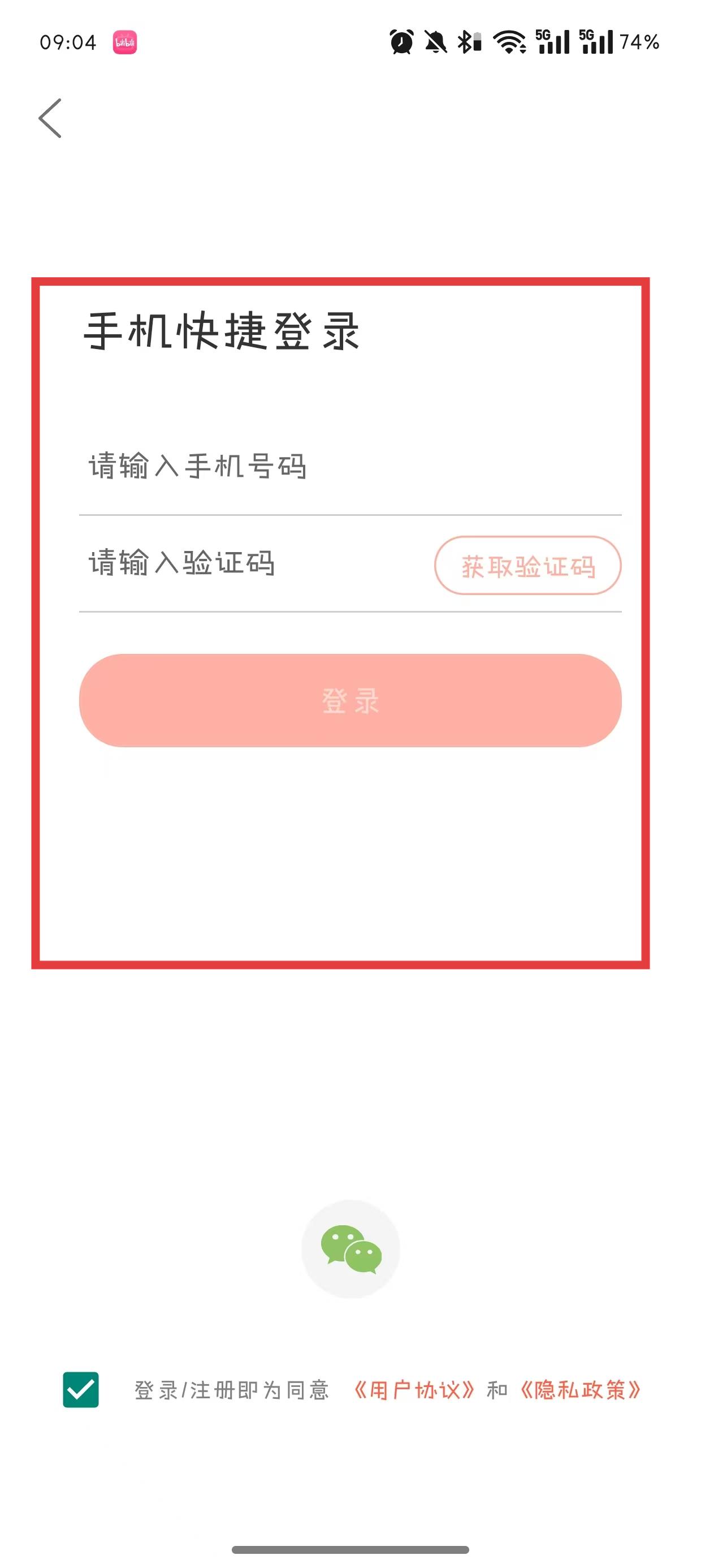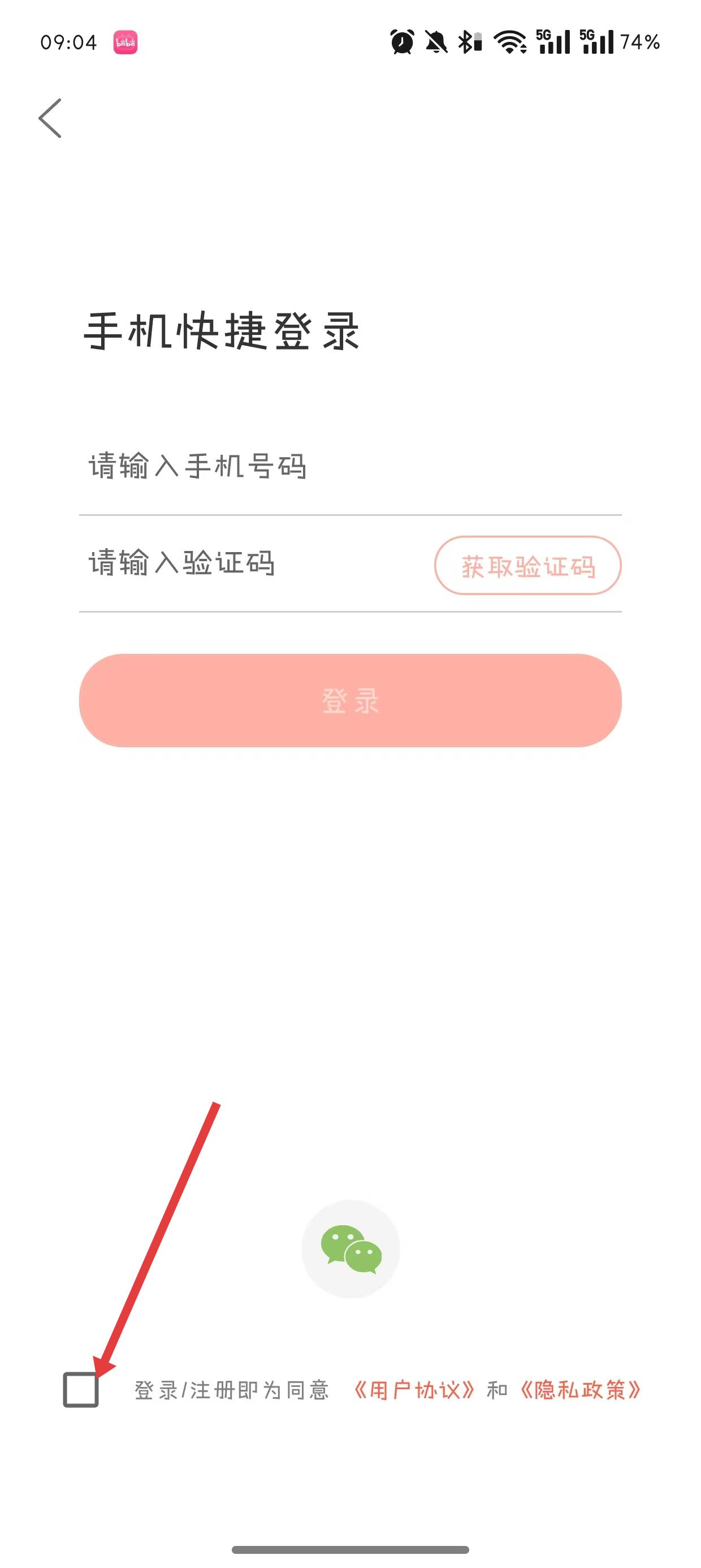 2、進入我的頁面,觸發登錄流程,跳轉至手機快捷登錄界面,先勾選頁面底部登錄或注冊即為同意用戶協議和隱私政策選項。