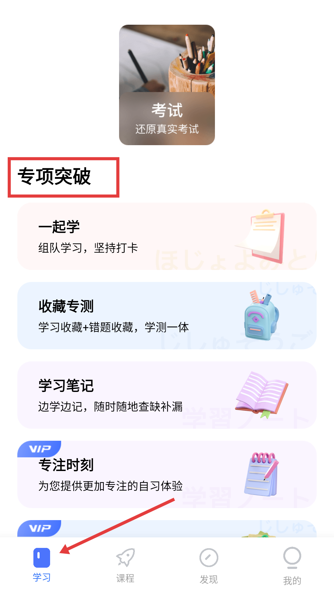 1、學習頁面有考試板塊還原真實考試,專項突破下有組隊學、收藏測等功能,還有VIP專屬的專注自習體驗。