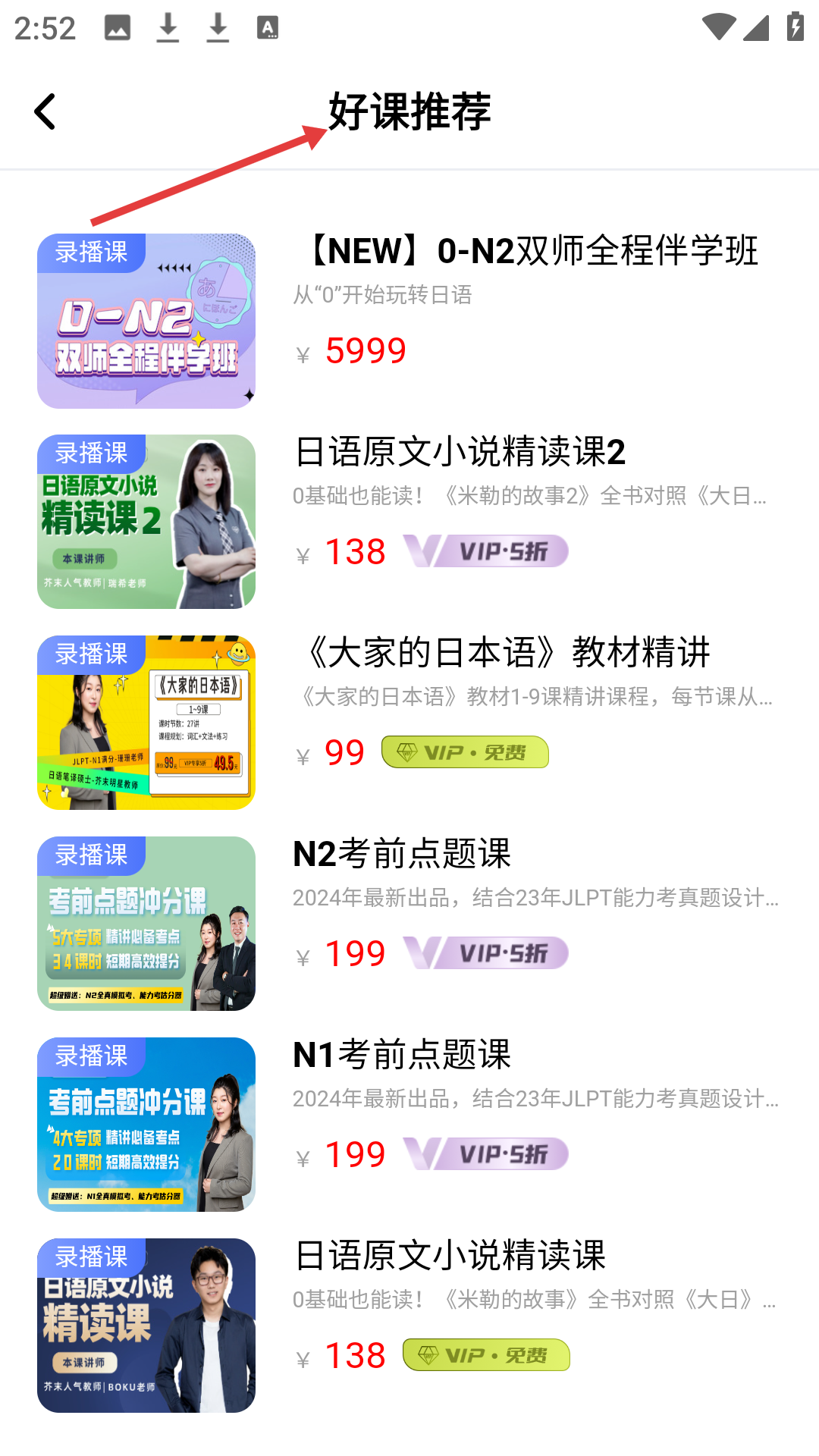2、好課推薦頁有0、N2雙師班、日語小說精讀課等,涵蓋不同日語學習需求,部分課程VIP享折扣或免費。