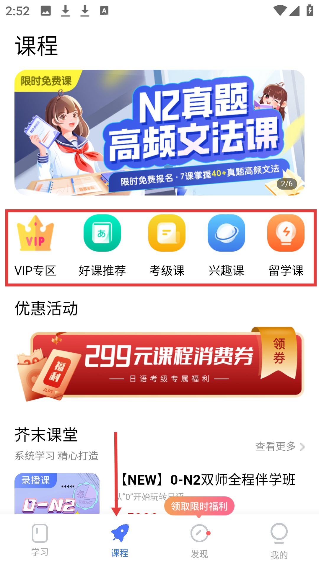 3、課程頁面有N2真題高頻文法限時免費課,設VIP專區、好課推薦等分類,還有299元考級專屬消費券可領。