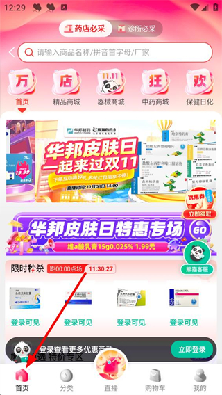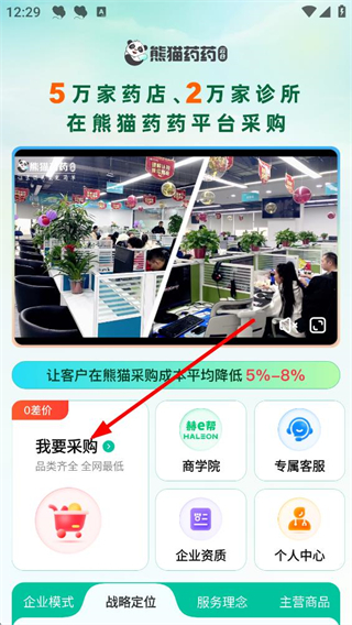 1、閱讀政策,同意后用熊貓藥藥,進首頁,點我要采購,選品類,用專屬客服,開展醫藥采購業務。