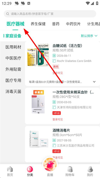 4、進入分類板塊,可選擇醫療器械、養生保健、普藥等分類,查看各類商品詳情,根據需求選擇合適的醫藥產品進行采購。