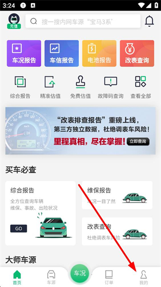 1、進入應用后可看到車況界面,這里有車況報告車信報告等功能入口,還有買車必查相關服務選項,底部導航欄有我的按鈕,點擊可進入個人相關操作。