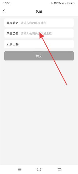 4、登錄后進入認證頁面輸入真實姓名、所屬公司、所屬工會等信息,點擊提交,完成身份認證。