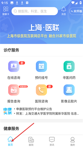 1、首頁,是上海市級醫院互聯網總平臺,融合35家市級醫院,有在線咨詢、預約掛號等多項診療服務功能,還有申康頭條資訊板塊。