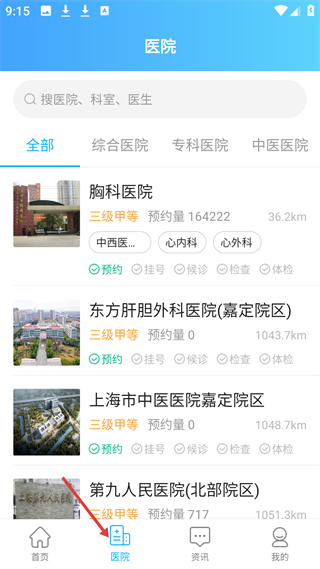 2、醫院頁,可搜索醫院、科室、醫生,分綜合、專科、中醫醫院分類,展示胸科醫院等多家醫院,標注醫院等級、預約量和距離。