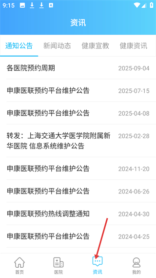 3、資訊頁,含通知公告、新聞動態等分類,展示各醫院預約周期、平臺維護公告等多條資訊,幫助用戶了解醫療服務相關通知。