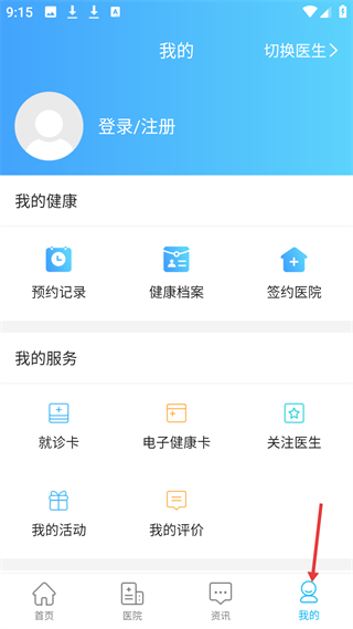 4、我的頁,可登錄注冊賬號,有我的健康預約記錄等和我的服務就診卡等功能,助力用戶全面管理個人醫療服務。