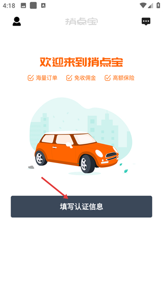 2、進入歡迎頁面可看到平臺提供海量訂單免收傭金高額保險等服務,點擊填寫認證信息按鈕,可進入后續的認證流程。