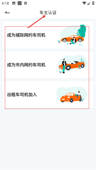 3、進入車主認證頁面,可選擇成為城際網約車司機市內網約車司機或出租車司機加入,依據自身需求選定對應的司機類型進行認證。