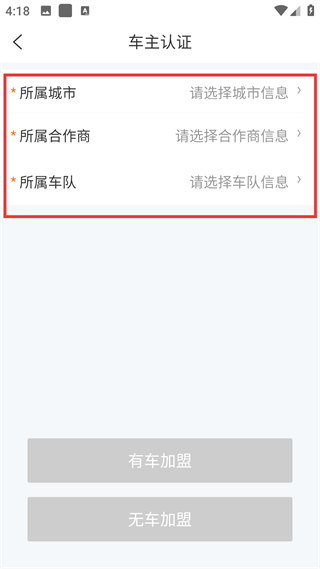 4、進入車主認證信息填寫頁,需選擇所屬城市所屬合作商所屬車隊的信息,之后可選擇有車加盟或無車加盟完成后續加盟流程。