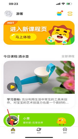 1、首頁,展示今日手工課程,含學習目標,提供新課程體驗入口,助力幼兒參與創意活動。