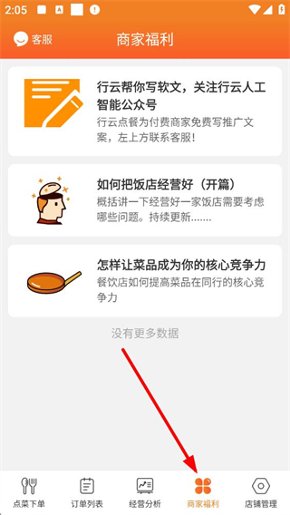 4、進入商家福利界面,可查看行云幫寫軟文、飯店經營、菜品競爭力等相關資訊,助力商家提升經營能力。