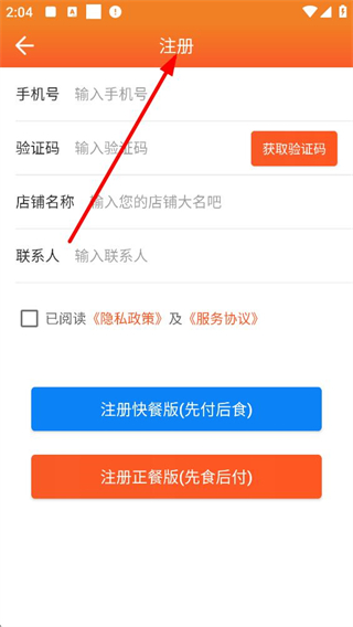 2、注冊時輸入手機號、驗證碼、店鋪名稱、聯系人,勾選協議后可選擇注冊快餐版或正餐版,滿足不同餐飲類型的注冊需求。