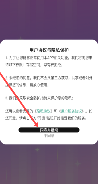 1、心旅相機軟件APP啟動時彈出用戶協議與隱私保護彈窗,點擊同意并繼續可接受協議并進入應用。