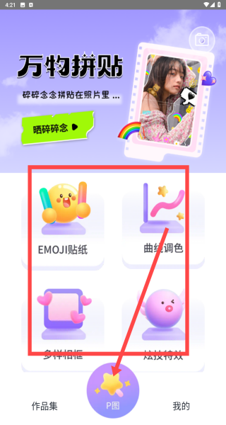 2、心旅相機軟件P圖界面,提供EMOJI貼紙、曲線調色等功能選項,可用于個性化圖片創作。