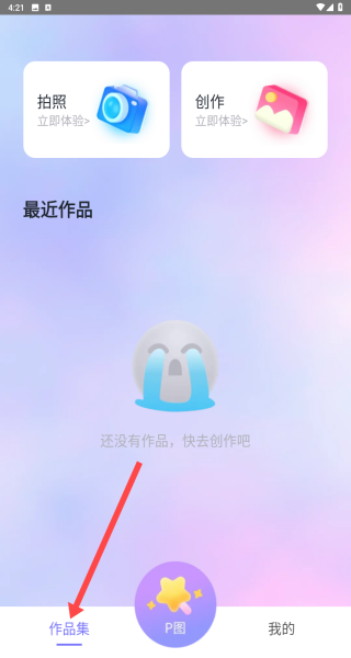 3、心旅相機軟件作品集頁面,展示拍照創作入口,目前無作品,可點擊相關按鈕進行創作。
