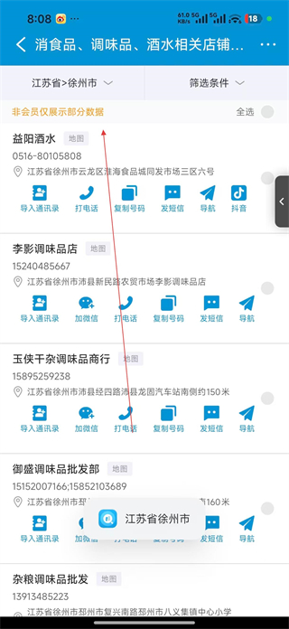 4、在店鋪名單頁面選擇地區后瀏覽店鋪信息,可點擊打電話加微信等按鈕,與店鋪建立聯系,獲取所需的供需資源。