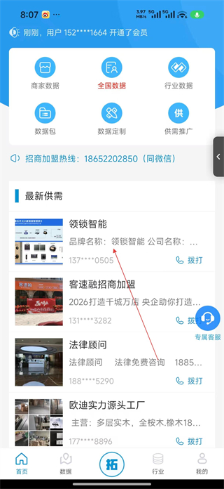 1、打開尋跡拓客軟件進入首頁,瀏覽最新供需板塊,選擇領鎖智能等信息點擊進入詳情頁,查看品牌名稱公司信息等內容,了解供需詳情。