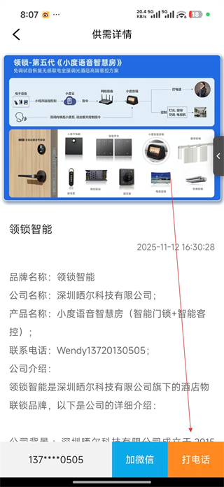 2、在供需詳情頁查看產品名稱聯系電話等信息,可點擊加微信或打電話按鈕,與相關方建立聯系,對接供需相關事務。