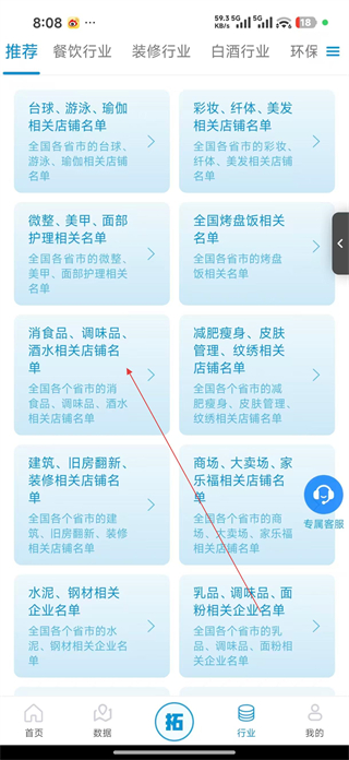 3、切換至行業頁面選擇餐飲行業等分類,找到消食品調味品酒水相關店鋪名單,點擊進入該分類的信息列表頁面。