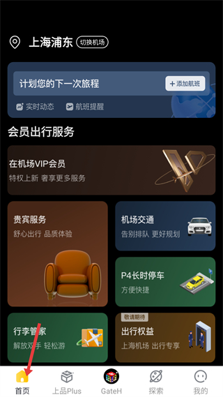 1、首頁,定位上海浦東機場,有計劃旅程功能,還有VIP會員、貴賓服務等會員出行服務,提供機場出行相關服務。