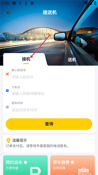 2、接送機頁,有機場接機功能,可查接機服務,還有預約泊車、停車繳費功能,方便機場接送和停車。