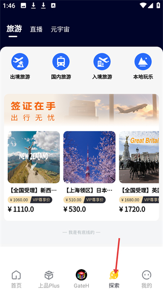 4、探索頁,有旅游板塊,涵蓋多類旅游和本地玩樂,還有簽證服務,提供旅游和簽證相關服務。