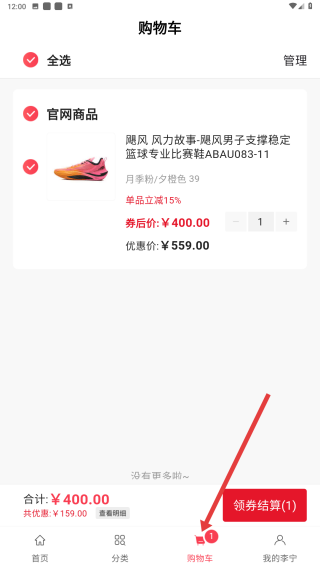 4、進入購物車頁面,可看到已添加的商品,確認商品信息無誤后,點擊領券結算,進行后續支付操作。