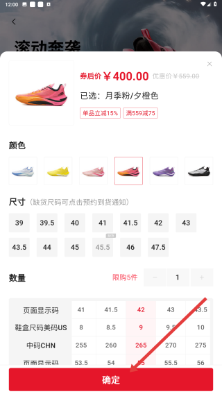 3、來到商品規格選擇頁面,選擇顏色、尺寸、數量等,選擇完成后點擊確定。