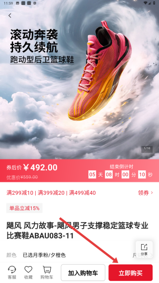 2、點擊進入心儀商品詳情頁,如跑動型后衛籃球鞋頁面,查看商品價格、優惠等信息,點擊立即購買。