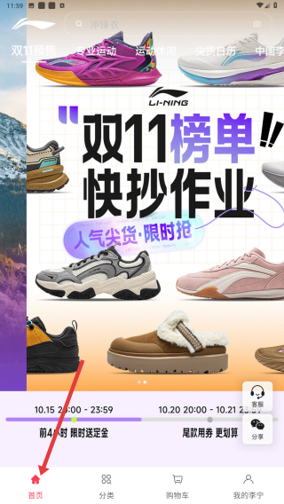 1、進入李寧購物APP首頁,能看到雙11榜單等活動宣傳,還有各類運動鞋服推薦,瀏覽商品找到心儀的商品。