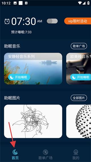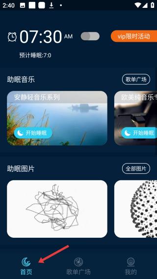 1、首頁設睡眠定時助眠音樂與圖片板塊,底部導航可切換至歌單廣場,是選擇助眠內容的起始操作界面。