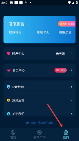 3、點擊應用我的頁面,能查看睡眠報告,集成賬戶中心等功能,方便管理個人信息。