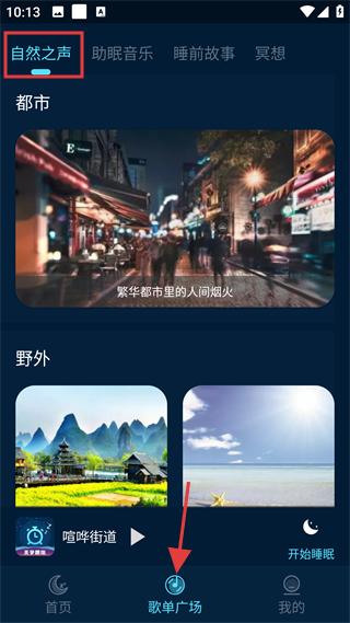 2、點擊應用歌單廣場頁,以自然之聲等分類,呈現都市、野外等場景音頻助眠選擇。