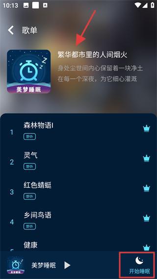 3、進入歌單詳情頁查看音頻列表,點擊開始睡眠按鈕啟動助眠播放,是內容選擇到啟動的過渡步驟。