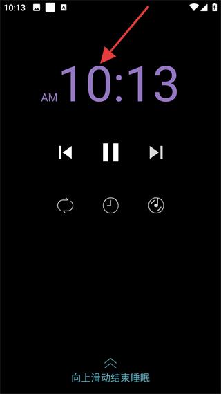 4、播放頁顯示時間,提供切歌暫停等控制功能,需向上滑動結束睡眠,是助眠過程的操作管理界面。