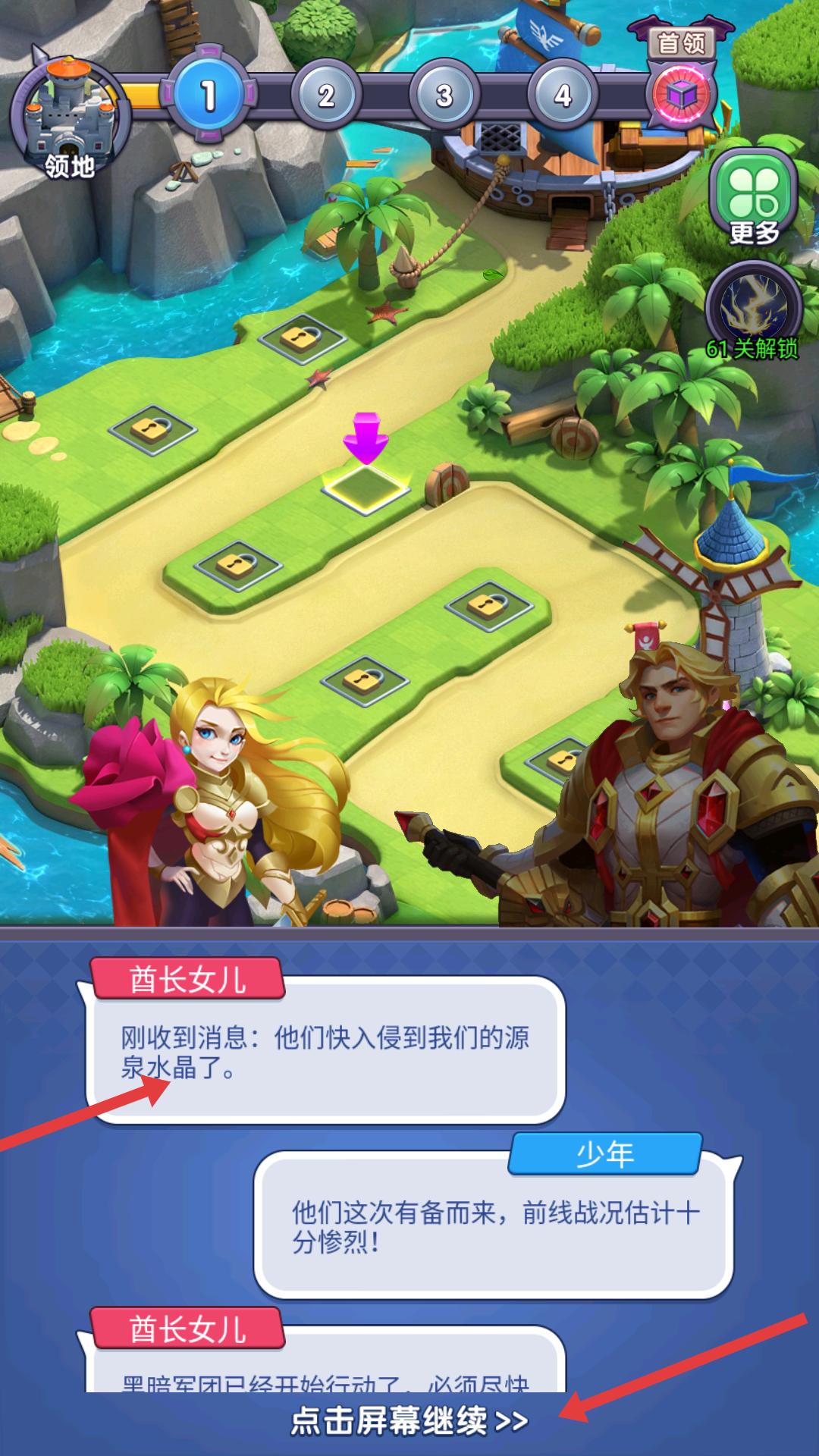 1、進入游戲,會看到劇情對話,了解到敵人即將入侵源泉水晶,點擊屏幕繼續,推進游戲劇情發展。