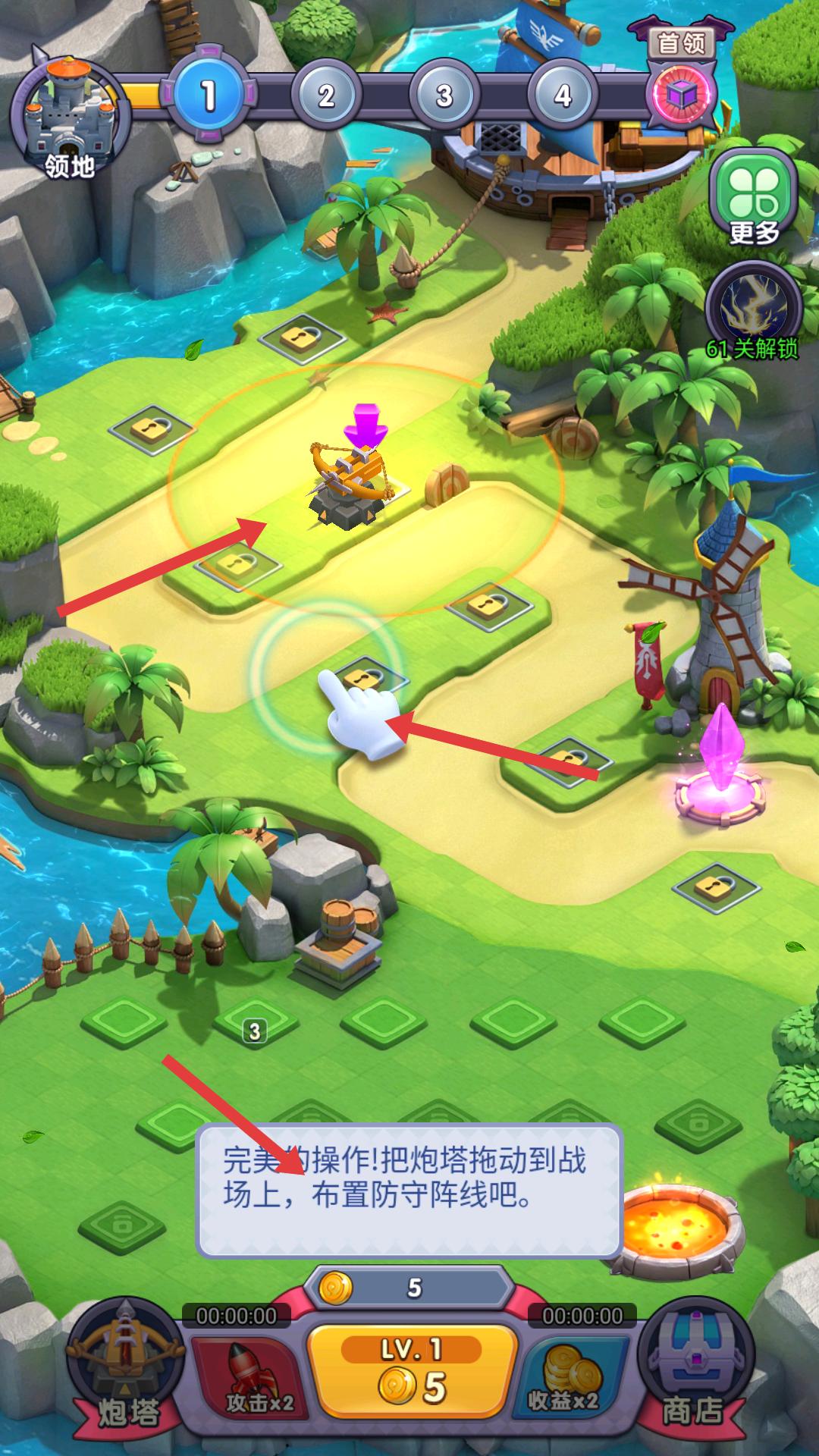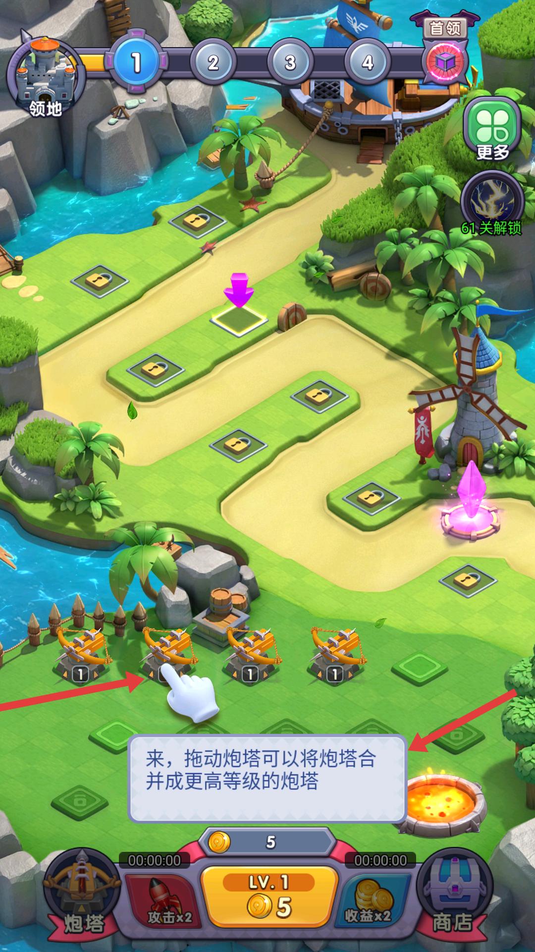 3、進入防御布置階段,可拖動炮塔,將其合并成更高等級的炮塔,提升防御能力,為保衛水晶做準備。