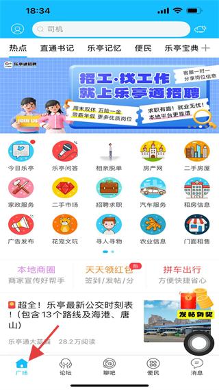 1、廣場有今日樂亭、樂亭問答等功能入口,涵蓋招聘求職等服務分類,展示本地公交時刻表等資訊,還有天天領紅包、拼車出行板塊。