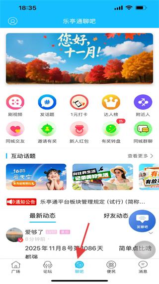 3、聊吧有刷視頻、發話題等功能,有達人榜等互動入口,展示互動話題、平臺公告及用戶動態,可發聊吧互動。